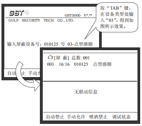 注意:在進行消防主機“屏蔽”操作中輸入設備的編碼時,可以使用通配符“*”,“*”代表這一位可以是0~9中的任意一個數字,這個功能可以方便的將一類設備取消屏蔽。例如:如果要屏蔽掉系統中所有的點型感煙火災探測器,我們可以在屏蔽操作時輸入:“******”,“TAB”,“03”,這樣所有點型感煙火災探測器將被屏蔽。其中“03”為點型感煙火災探測器設備類型代碼。