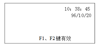 密碼正確后顯示如上面菜單,密碼錯誤則返回封面菜單。  其中小時處(即數字“10”反顯,用“F1”鍵進行切換,依次反顯時、分、秒、年、月、日,用“F2”鍵進行反顯處時間修改,每按一次“F2”鍵,反顯處數字增一。